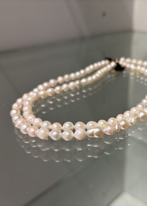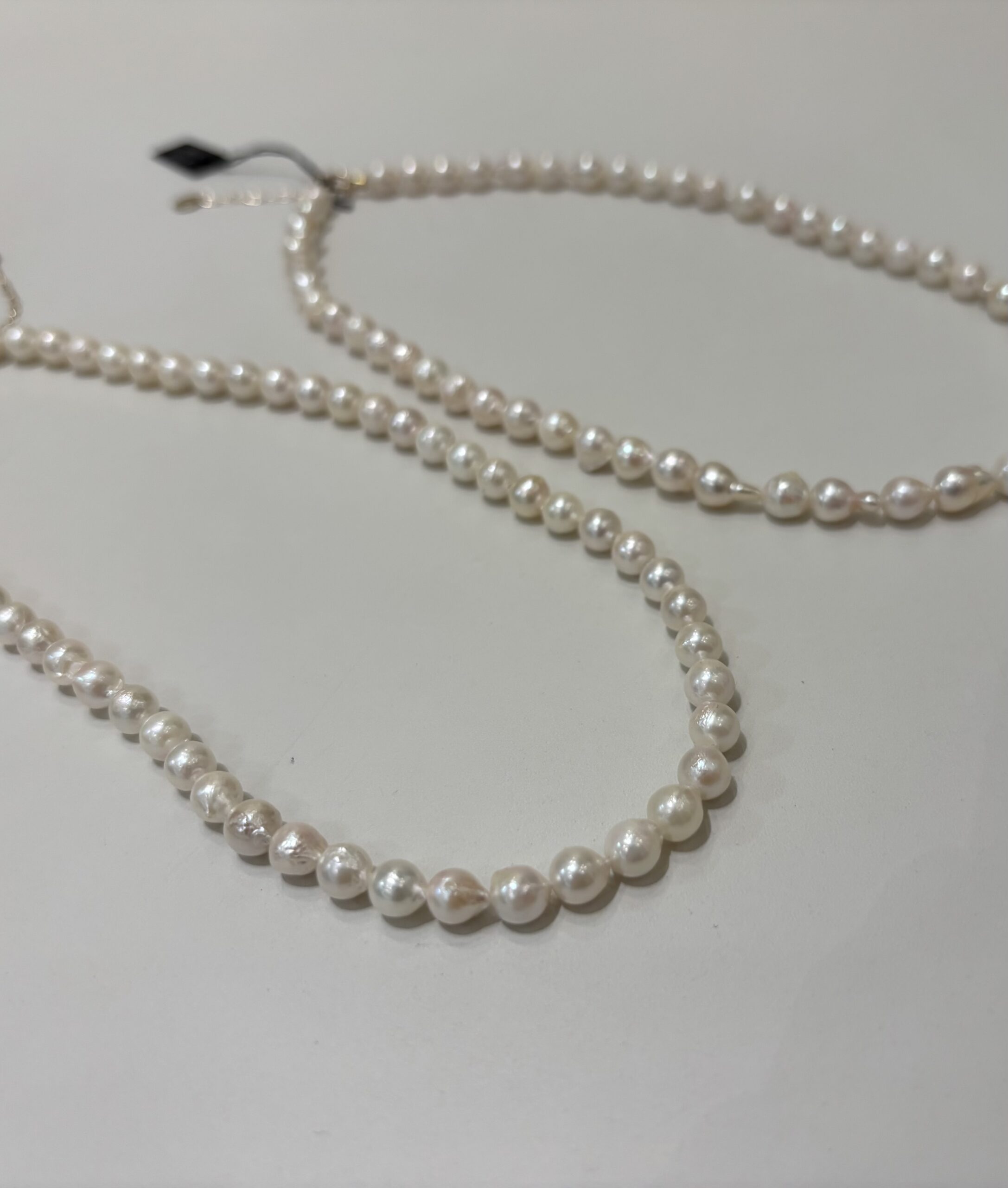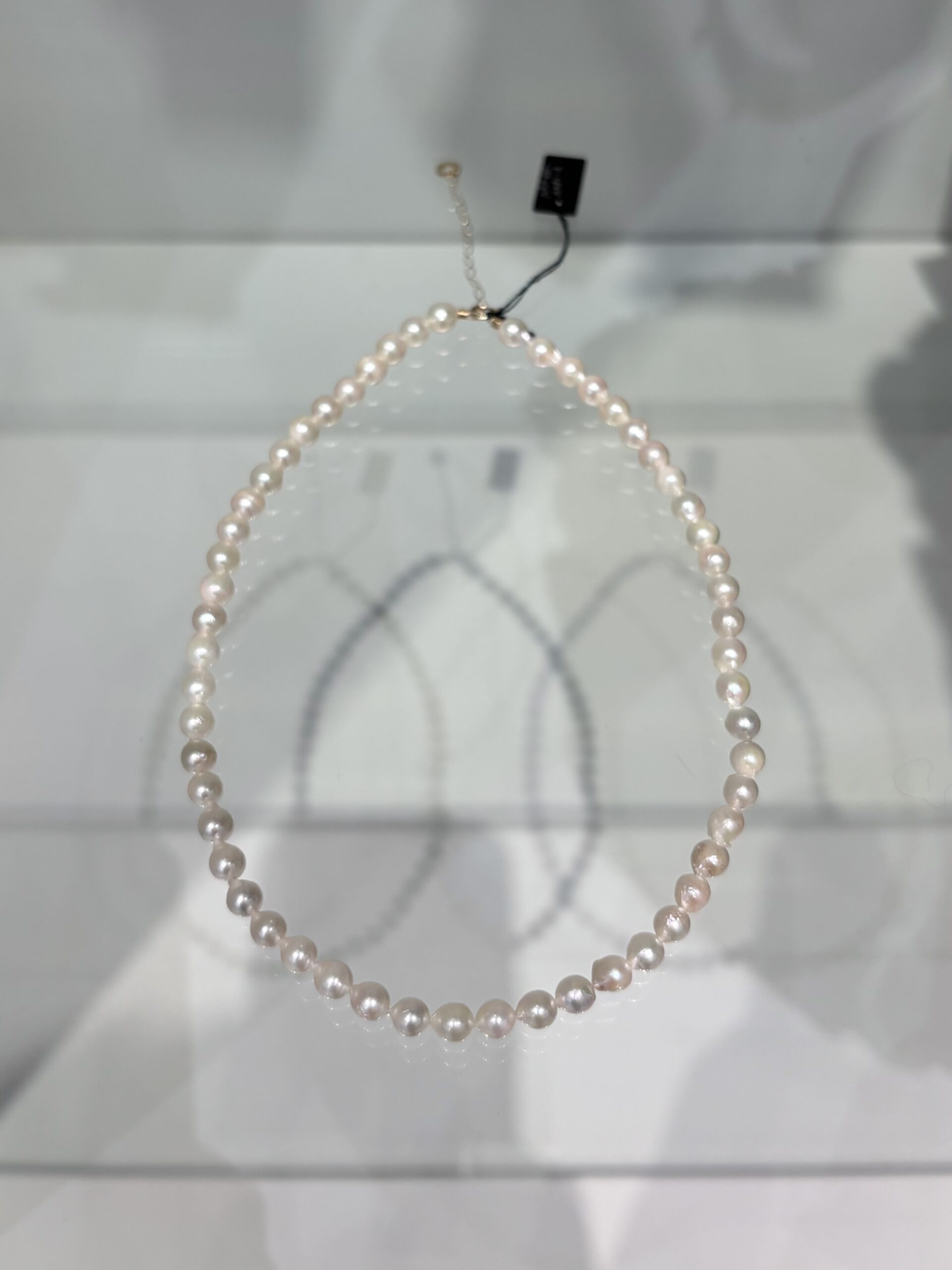 カジュアルとフォーマルのあいのこと言ったような、趣ある6〜6.5mm玉の、ツヤのとてもきれいな1点ずつ個体差のあるパールをつないで、