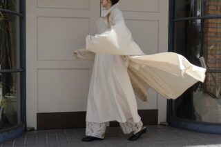 フロントはダブルジップ、そして両サイドにファスナーの開閉でスリットを作ることができるので、ボトムのデザインやボリュームに合わせて調整していただくと全体のバランスが取りやすくなり、足さばきも良く着ていただけます◎