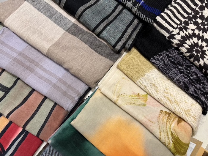 縦横に柄を織り込むか、エキゾチックな手法で手染めしたストールが届いています。