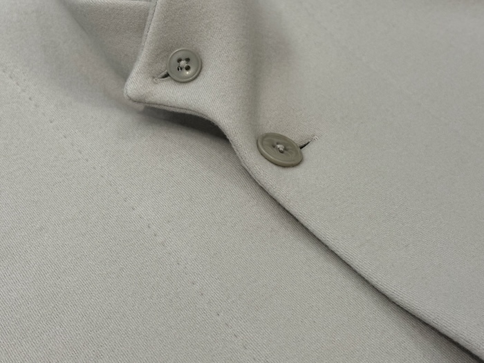 着こなしの基本はスタンドネックで、フロントボタンもしっかり留めて、シルエットと生地の美しさを感じてほしい。