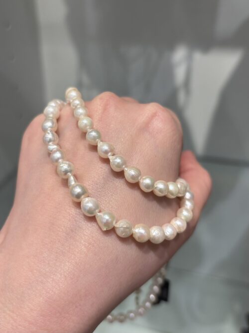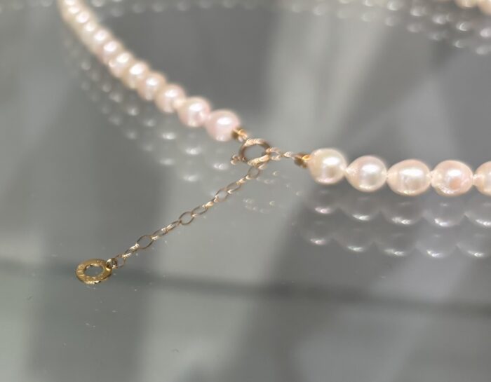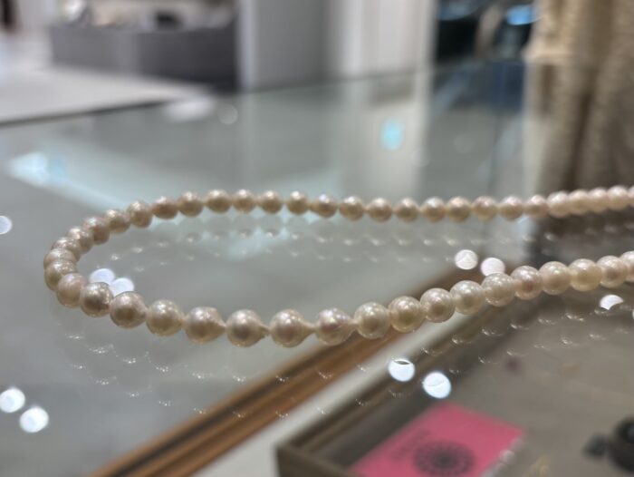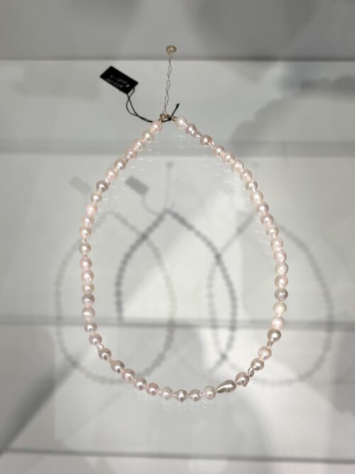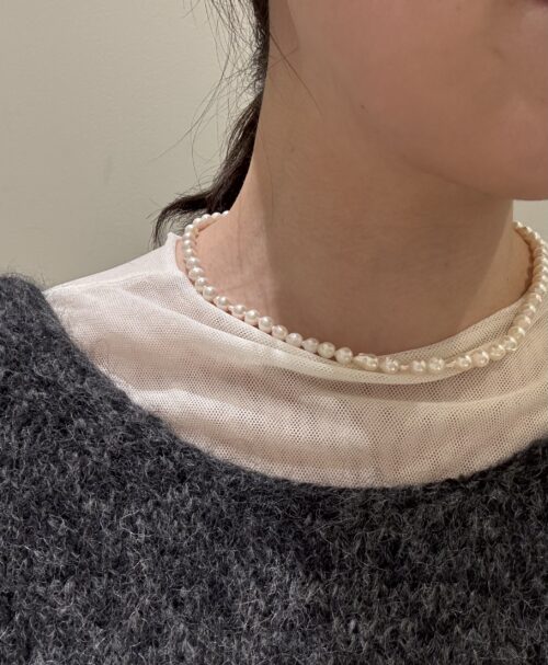カジュアルとフォーマルのあいのこと言ったような、趣ある6〜6.5mm玉の、ツヤのとてもきれいな1点ずつ個体差のあるパールをつないで、