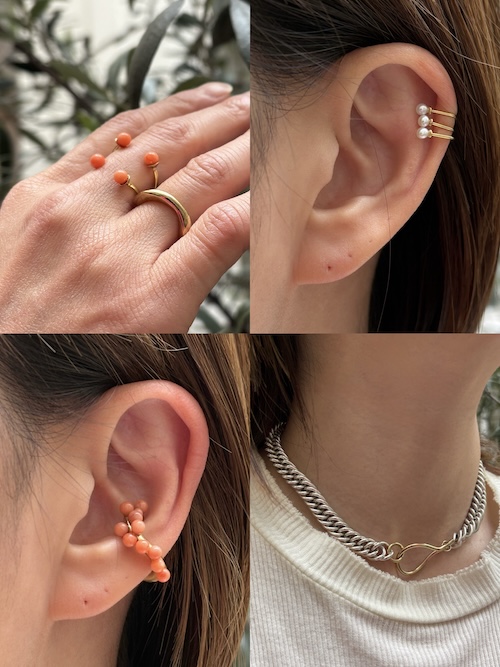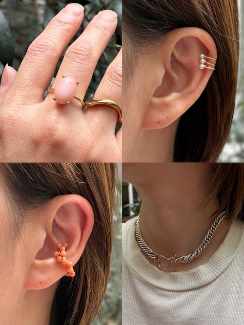 肌馴染みの良いサーモンピンクカラーの珊瑚をパーツに取り入れたリングやイヤーカフ、そして定番として一つは持っておきたいチェーンシリーズまで。