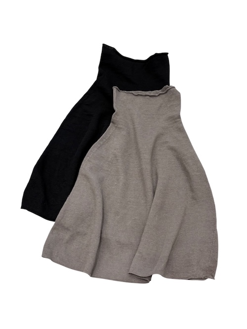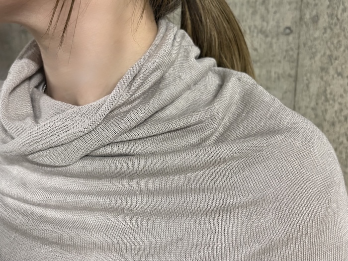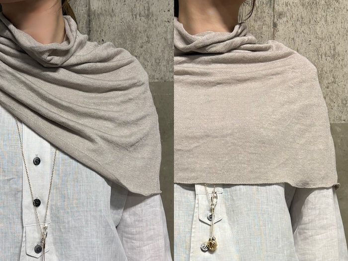 evam evaから毎シーズン素材を変えながら登場するスヌードは、リネン糸をホールガーメントで編み立てたシームレスシリーズ。