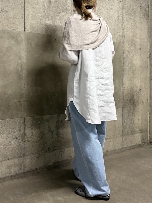 デニムとの合わせがシンプルに格好良いけれど、サマーニットのスヌードでニュアンスをプラスしても良い。