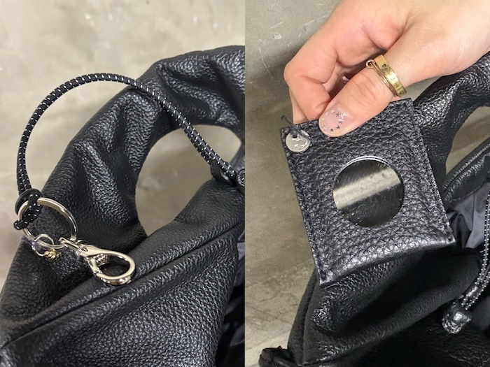 バッグには必ず付属されているミニミラー、フック、余り生地を採用した内ポケットもついています。