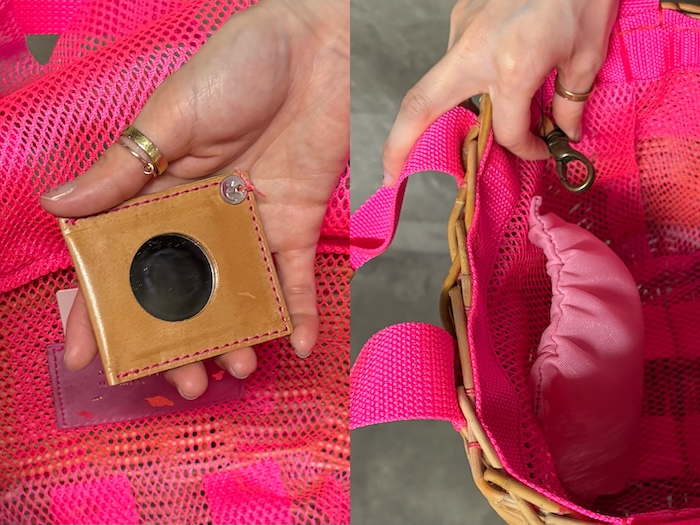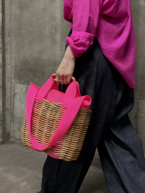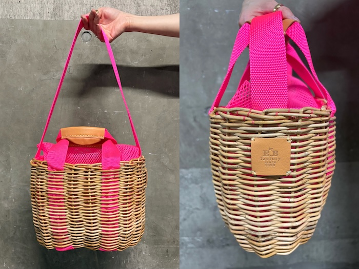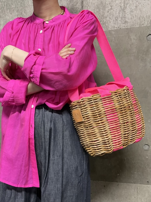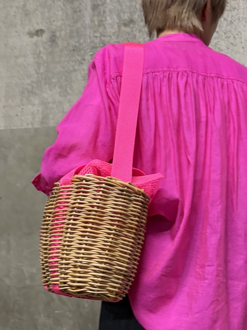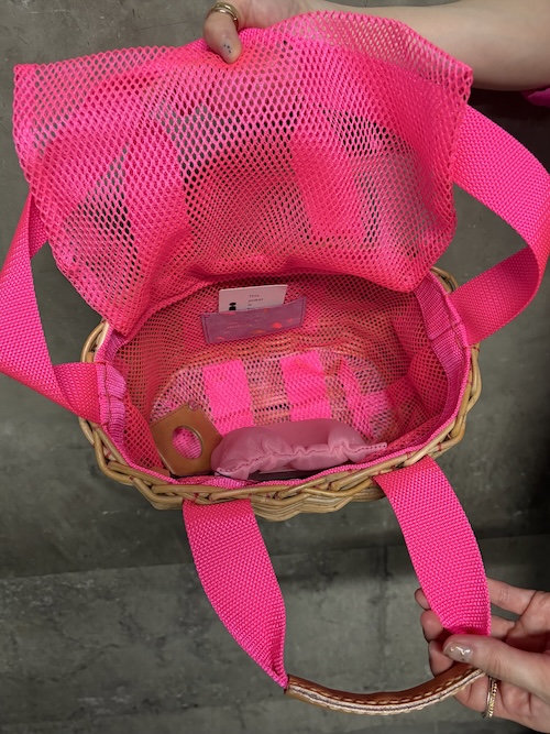 籠の間から覗く生地も、かぶせのメッシュも、内側を固定する糸も、全てがネオンピンクの心踊る2wayバッグです。