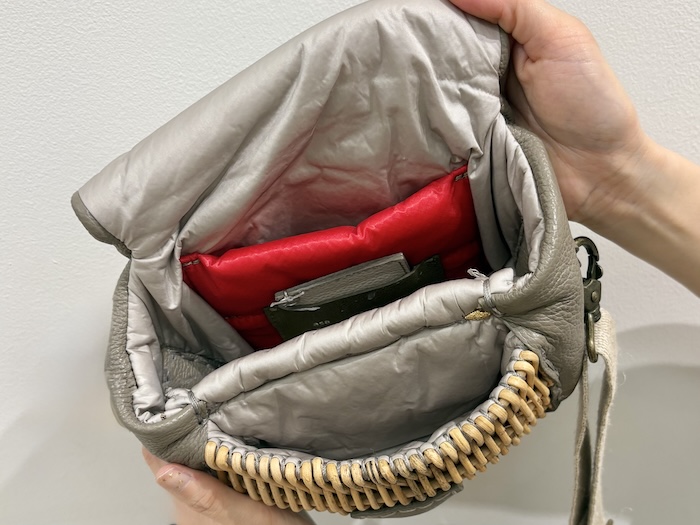 メインとなるバッグ部分にもポケット(2026SSシーズンは赤♡)が付属されているので、小さいバッグながら収納機能も優れています。