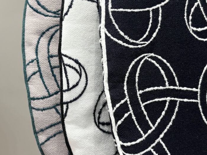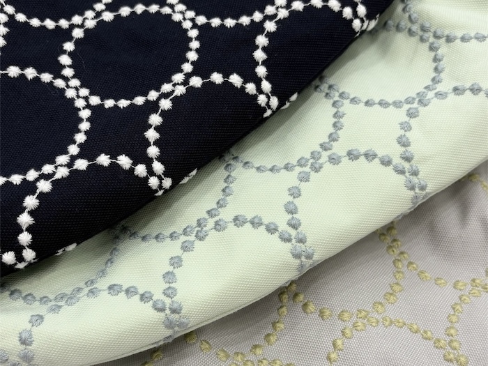 ブランドらしい曲線を用いた幾何学模様は、シンプルな一筆書きのような刺繍がどこかモダンな印象となります。