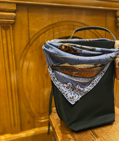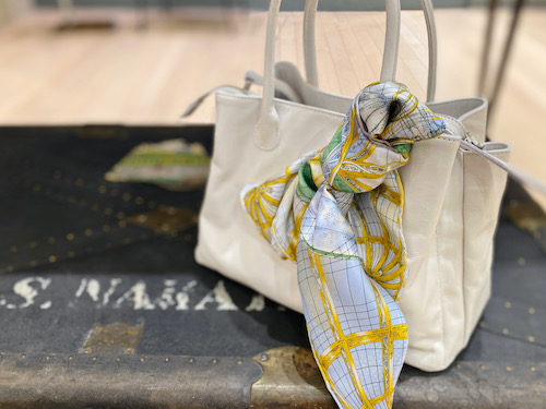 ─ 小さめのシルクスカーフはアクセサリー感覚でバッグに巻いても◎