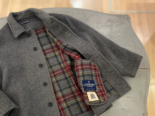 LONDON TRADITIONといえば伝統的なダッフルコートや、Pコートが日本でも有名ですが、今回UNFILでは、暖冬の日本に合わせて、メンズのワークジャケットを別注。