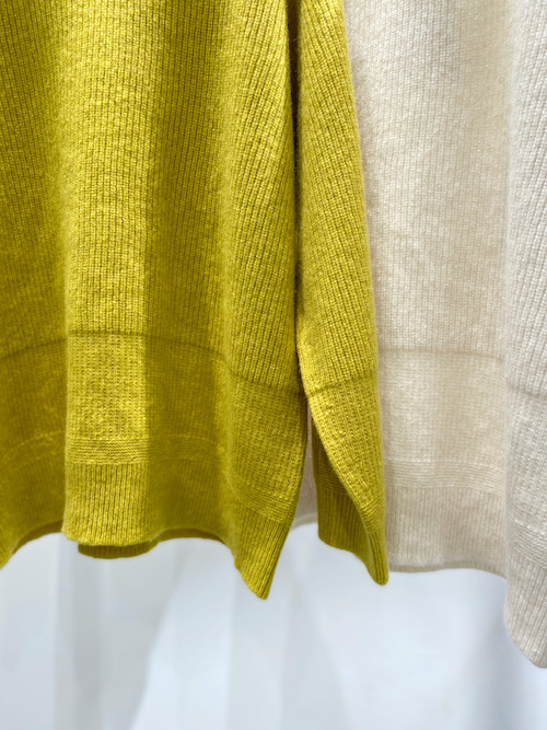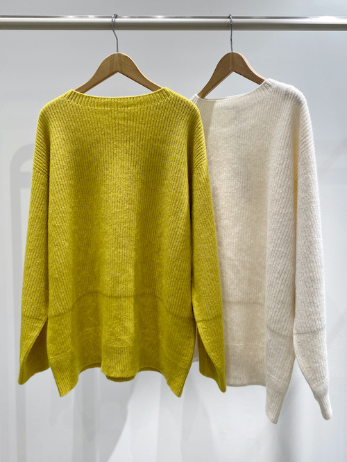 毛足の長いモヘアの特徴を活かし、軽くてふわっと仕上がるように度目調節をして編まれたハンドニットの風合いをお楽しみください。