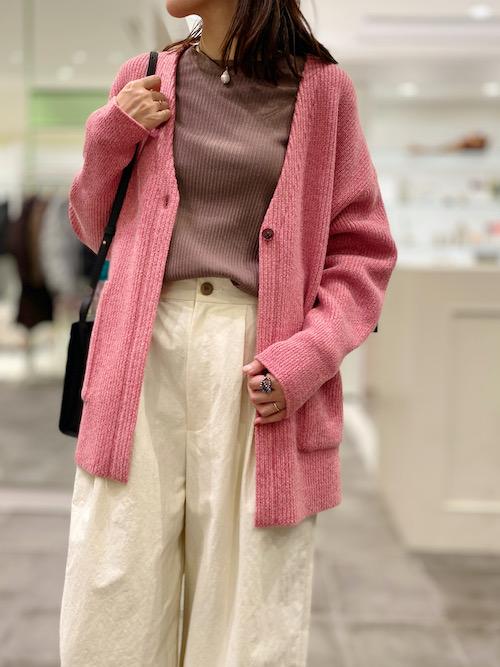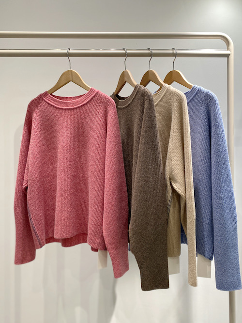 ピンクやサックスブルーといった発色の綺麗なカラーニットにも注目です。