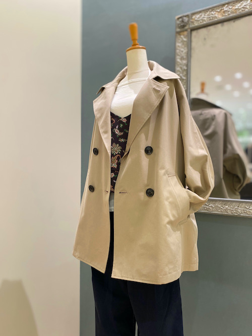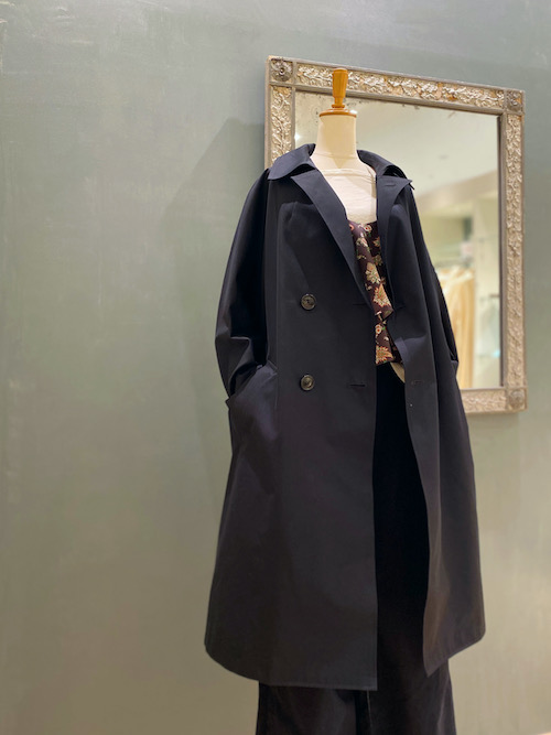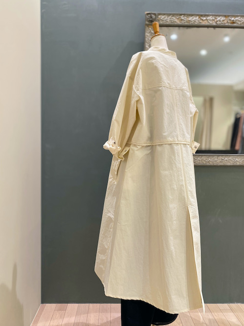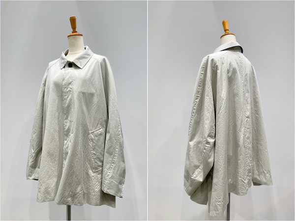 シンプルに見えて拘りが沢山で、シワ感のあるナチュラルや風合いに、たっぷりと空気を纏ったような軽さ、モッズコートのような丸みのあるスリーブデザインもポイント。