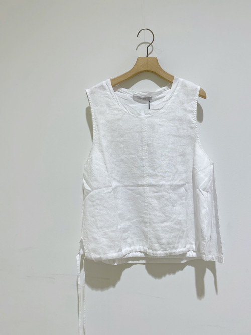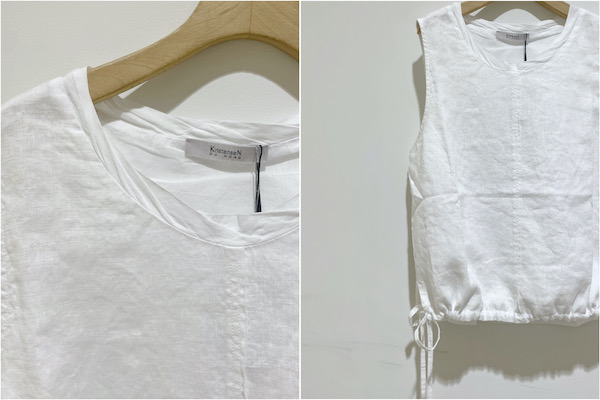 シンプルなノースリーブブラウスに見えて、実は 襟ぐりと裏地には柔らかなコットンがあしらわれ、サイドから裏地が覗くレイヤードデザインになっています。