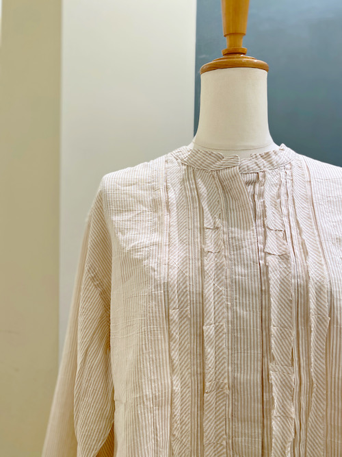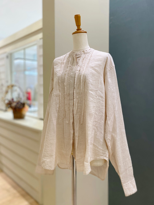 爽やかなストライプブラウスは、フェミニンな雰囲気のピンタックがフロントにあしらわれ、長めのお袖や、丸いヘムラインなど、さり気ないこだわりの仕上げが詰まっています。