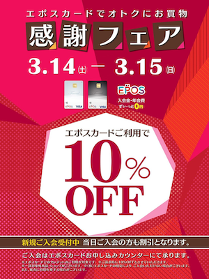 3月14日(土)、15日(日)の2日間はエポスカードご利用のお買い物で10%OFFに♩