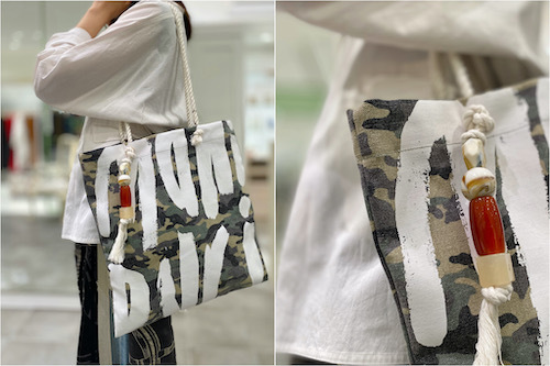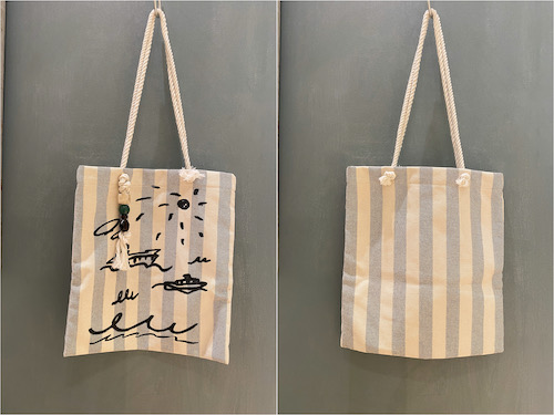 アートのような大胆なプリントで、ハンドルはロープ仕様にアクセントパーツをあしらい、程よい抜け感と存在感をプラス。