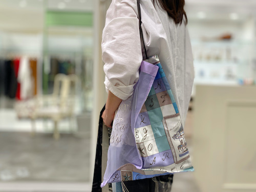 シルクスカーフの柄をそのままのプリント技法で帆布生地にプリントしたトートバッグ。