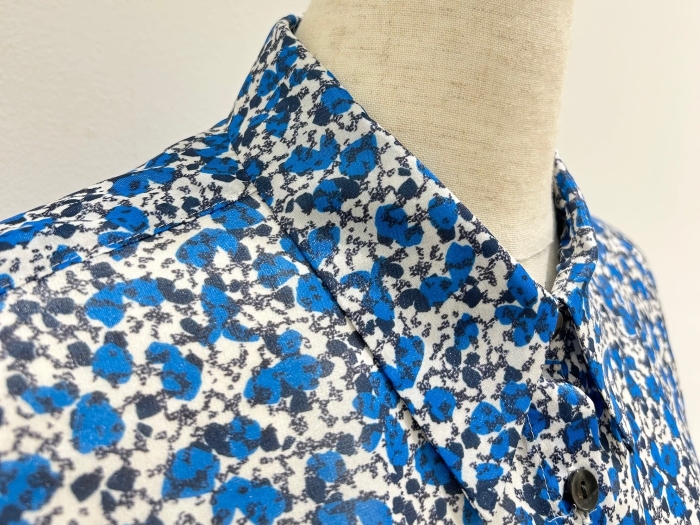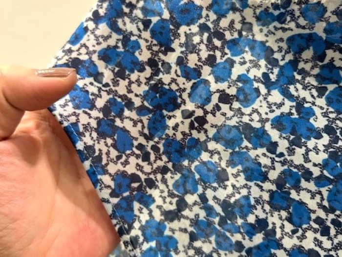 少しハリのある小花柄のプリント生地は、目を凝らしてみるとさり気なく光の反射でキラキラと光り、ほのかにシアー感も。