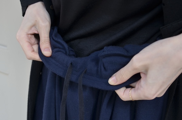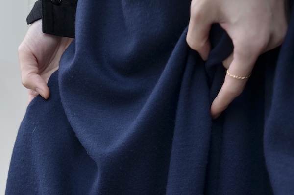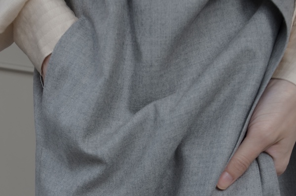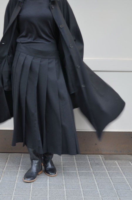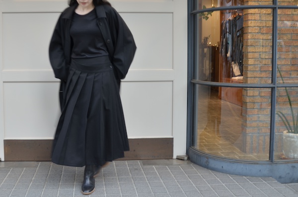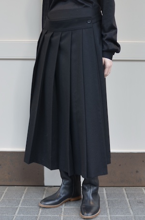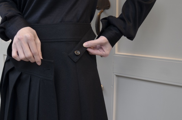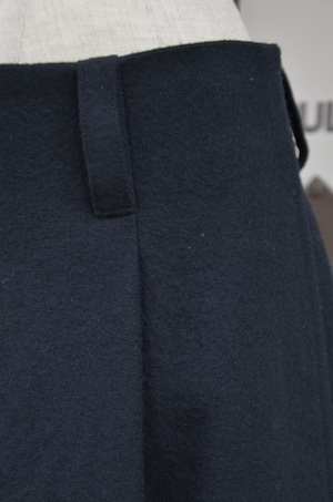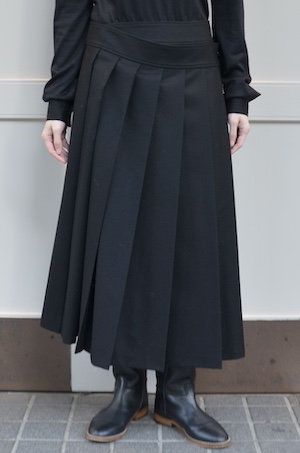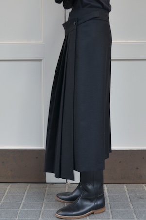 こちらはウールフランネルの変形スカート。前身頃のみアシンメトリーのプリーツがエプロンのように重なったデザインです。