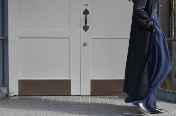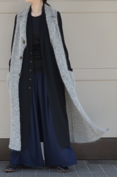 black x light greyの繋げ役に、美しいdark blueのワイドパンツを。
