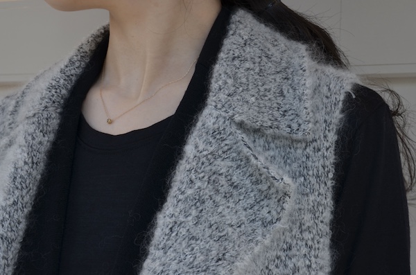 毛足の整ったファブリックは明るいグレーの色味でありながら深みがあり、色浮きのしないトーン。デニムなどカジュアルなボトムとの組み合わせも間違いなく素敵です。