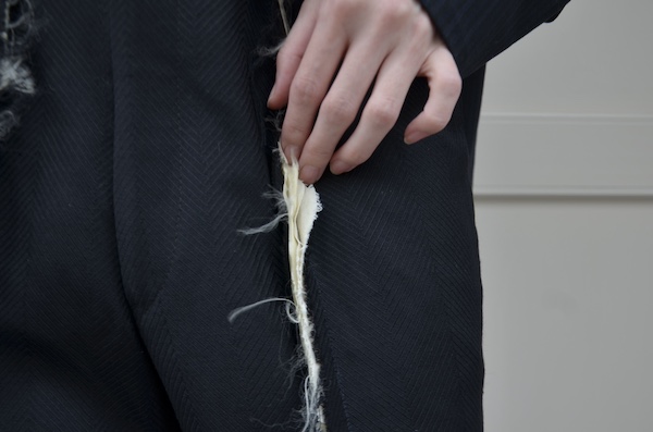フロント部分にだけハサミを入れ、バックはダーツを施したのみ。そのふたつの工程だけで、新たなフォルムを構築しています。