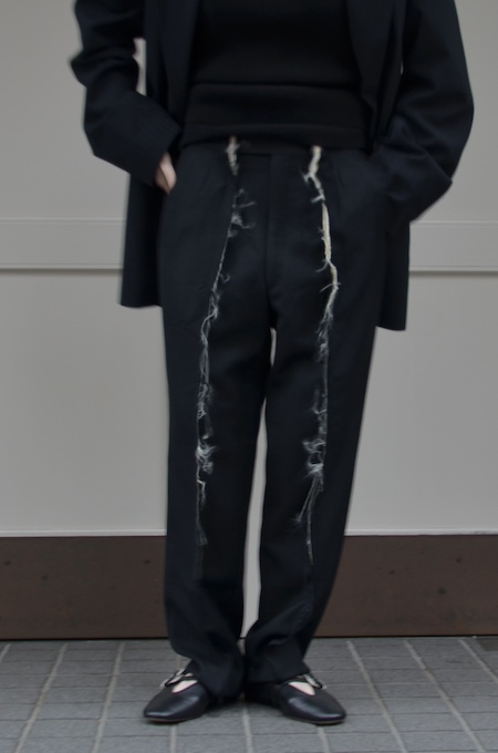 それらの素材を全て同じ手法で仕立て直し、DIOGUARDIのアイコニックなテーパードシルエットに仕上げています。
