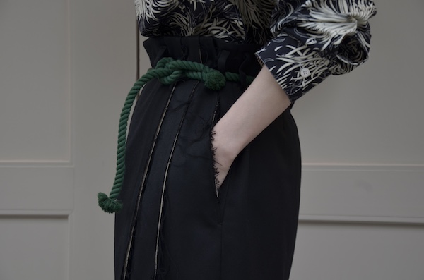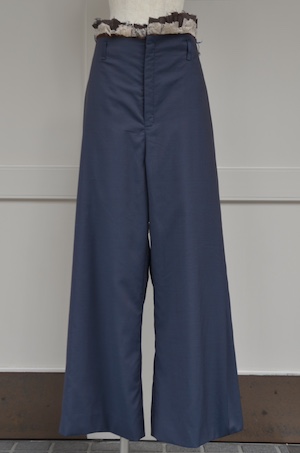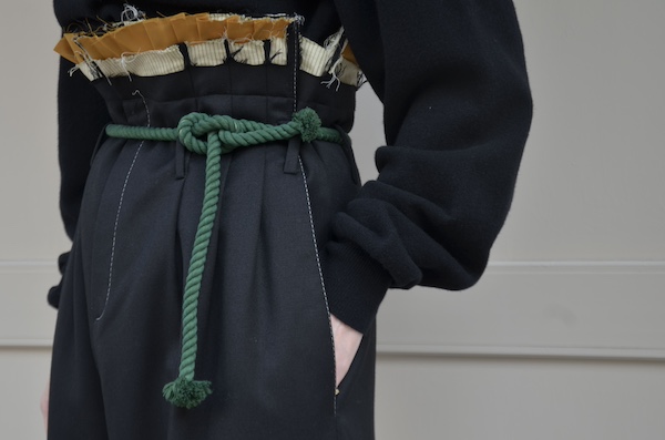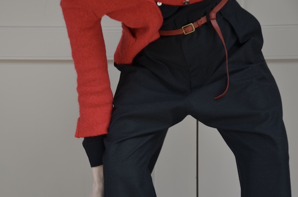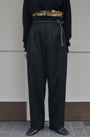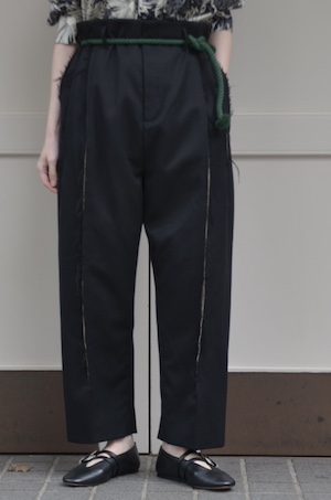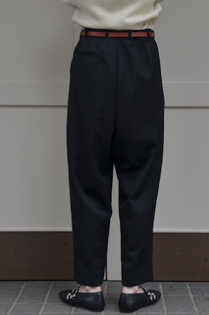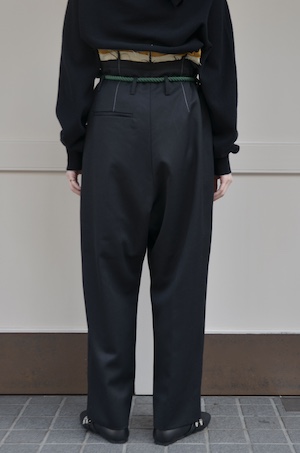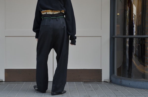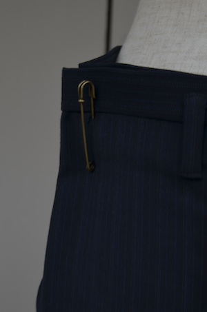 彼自身が手作業でカットするウエストのディテールがよりいきるよう、ベルトループは低めに配置。しっかりと縫い付けられた高さのあるプリーツにより、ハイウエストでもローウエストでもシルエットを保つように作られています。