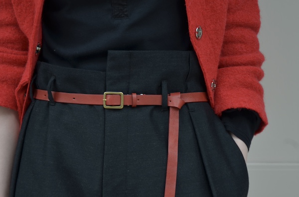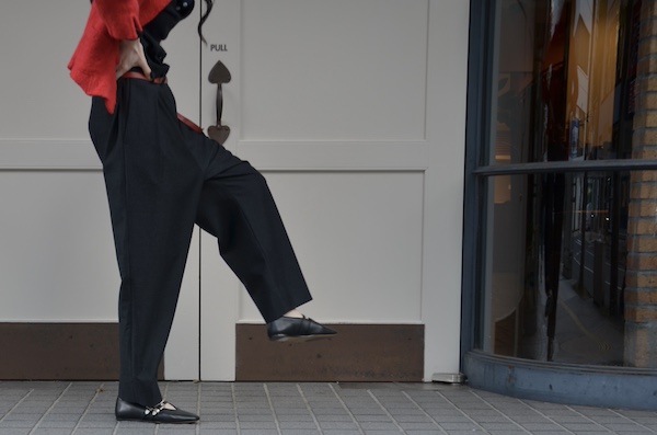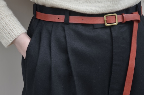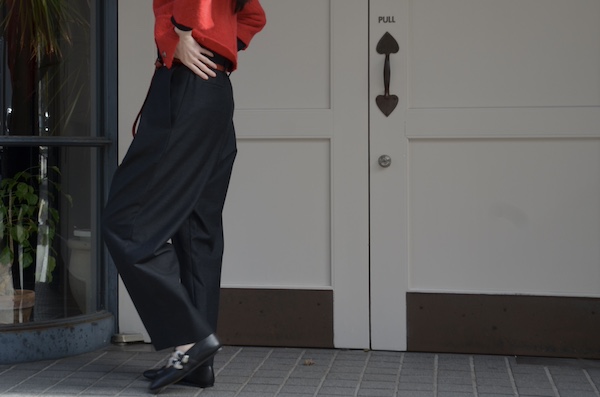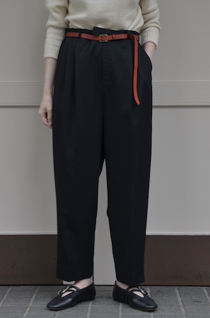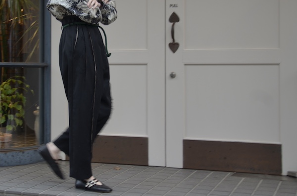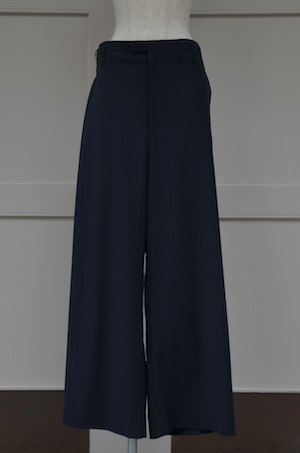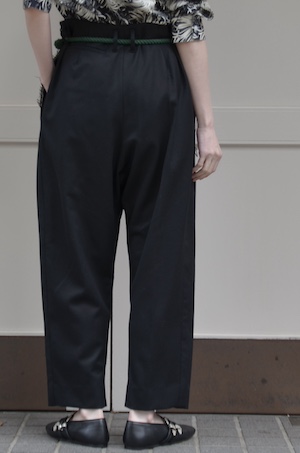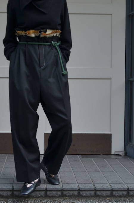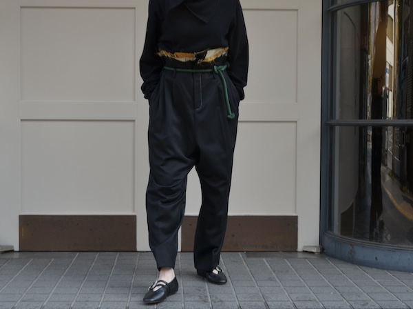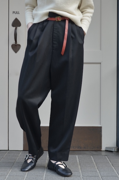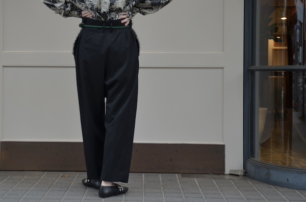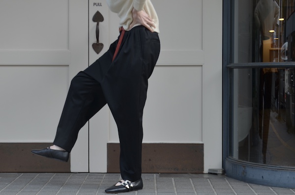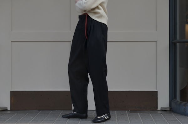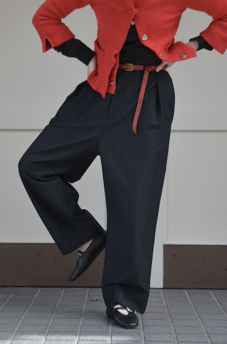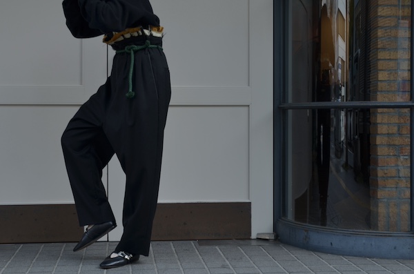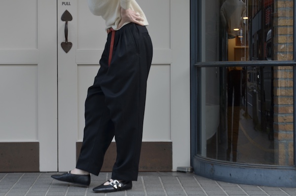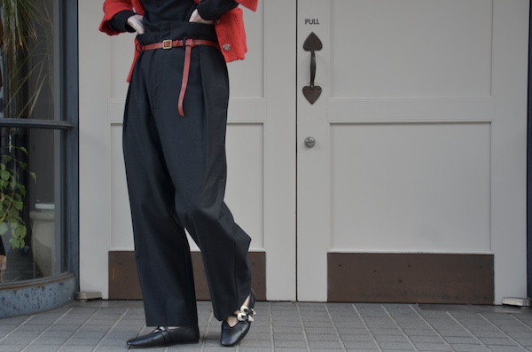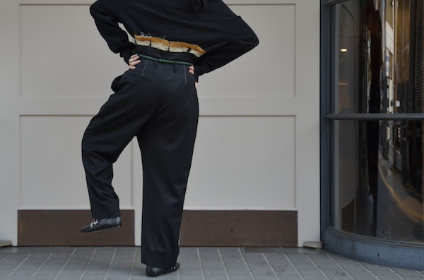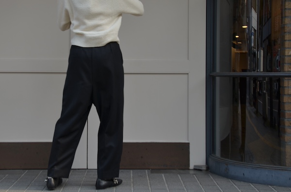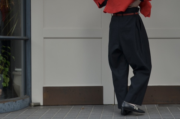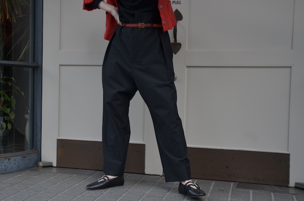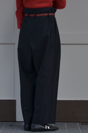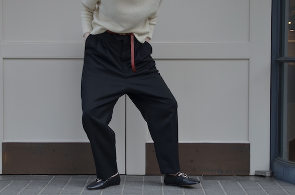 ハイウエストに3本のプリーツ。股上が深く作られているにも関わらず、足を通してみると驚くほど違和感がありません。非常に履き心地が良い。