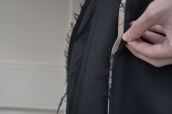 段差のように左側を高くしたウエストラインはキャバスで補強することでデザインが維持されています。