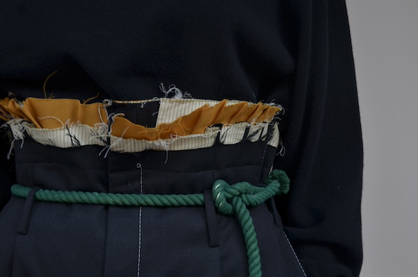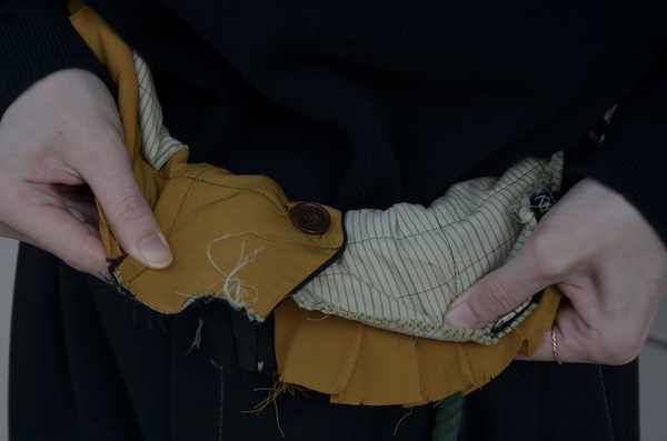 目を引くフロントのプリーツ部分にはジャケットのキャンバス芯を使用している為、001より立体感を感じるフォルムに。このディテールはシルク糸で縫い付けてからカットし、金属ブラシでほつれを作り出しているそう。