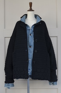 black:クロシェ編みのパーツを用いたblack knit jacket。デニムジャケットの上に羽織れるほどのシルエットですが、厚みは意外とありません。時にアウター、時にカーディガンとして。他では出会えない特別さとスタイリングしやすい利便性の両方を兼ね備えた一枚。¥242,000 (HIROMI TSUYOSHI)