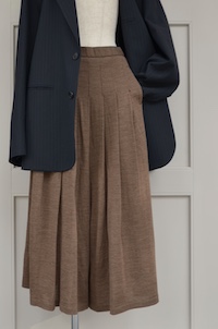 mocha:ハイゲージニットで均等にプリーツを作るという職人技術が詰まった一枚。ロング丈のキュロットのようで、今の気分にぴったりです。裏地付きなのでタイツを履いても履き心地が良い点も◎¥77,000(HIROMI TSUYOSHI)