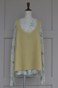 yellow:カシミアウールのふんわりと柔らかい肌触り。卵のような優しいイエローがなんとも可愛い。広めのネックラインなので襟元にデザインのあるシャツやブラウスとの相性も良い一枚。¥69,400(Christian Wijnans)