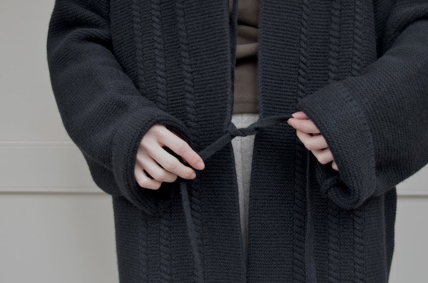フロントはアレンジが楽しめる紐の仕様で、ボタンやファスナーよりもすっきりとした印象に。