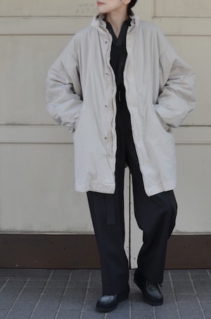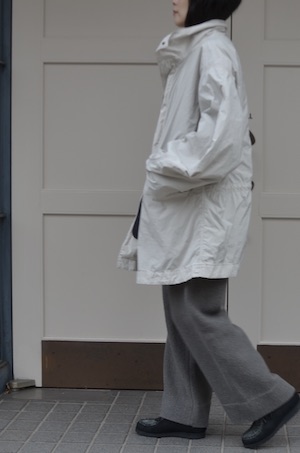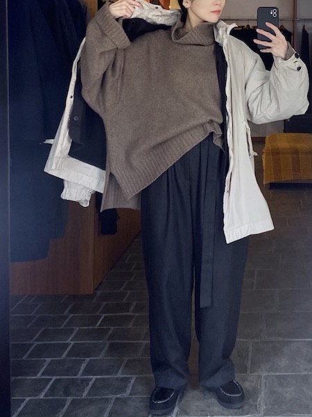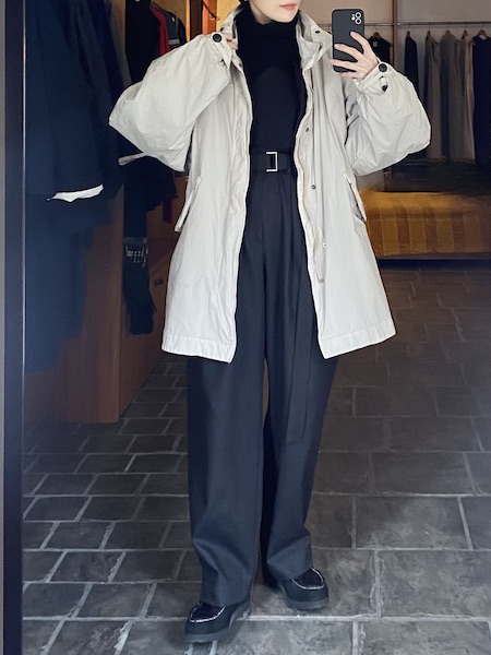 普段着ているお洋服もダークな色が多いので、明るい色のアウターは組み合わせがしづらかったのですが、この色は真っ白ではなくグレー混じりの”WALM WHITE”なので、ダークカラーと合わせても色が浮くことなく馴染みやすいです。