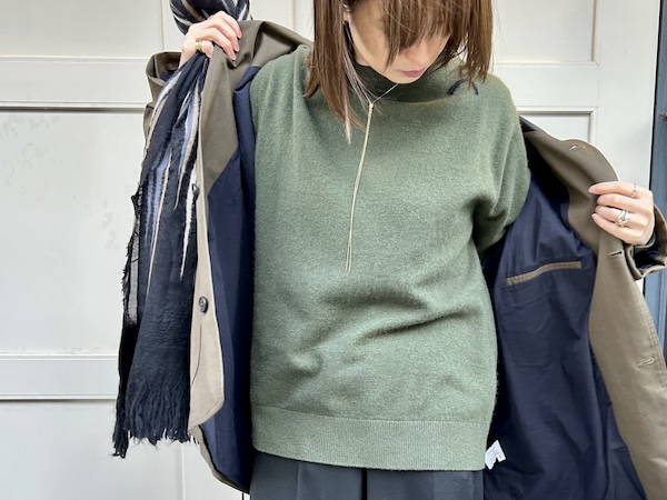 寒くなってきた今時期はLERET LERETのカシミアのニットと合わせて着ているのですが、裏地が付いているため風を通しにくく、見た目以上に暖かいです。