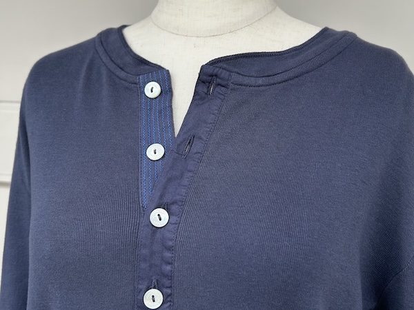 首元には上品な光沢のあるシェルボタンを使用しているのでさりげない高級感もあります。またブルーのステッチがSchiesserらしく一枚でもカーディガンやジャケットのインナーとしても幅広くお使いいただけます。