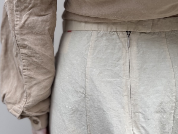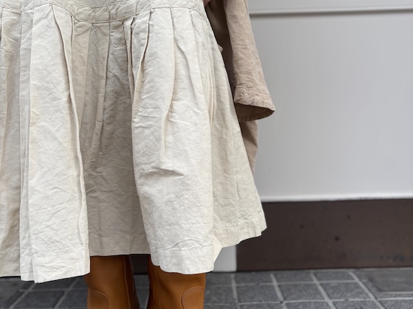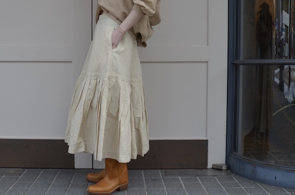 腰回りはスッキリとしたシルエットで、切り返しから下にプリーツが施されておりシルエットに沿った自然な膨らみがほんのり甘さがプラスされた一枚。