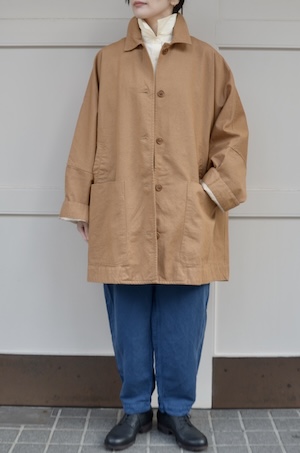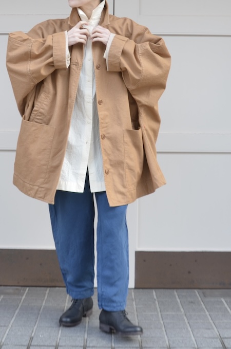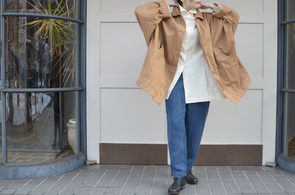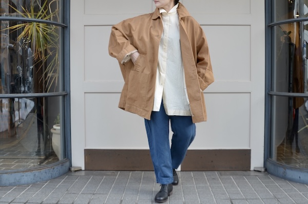 CASEY CASEYといえばジャケット。こちらはコートとジャケットの中間のような長さで、見た目よりも柔らかく軽い生地が特徴。キャメルという色合いも新鮮でシーズンカラーブルーのボトムとも相性がとても良い。型は身幅にゆとりのあるラグランスリーブの仕様でインナー次第で着られる季節も幅が広く合わせやすい。後部分に入ったタックによる立体感がさりげない存在感を演出してくれる一枚です。