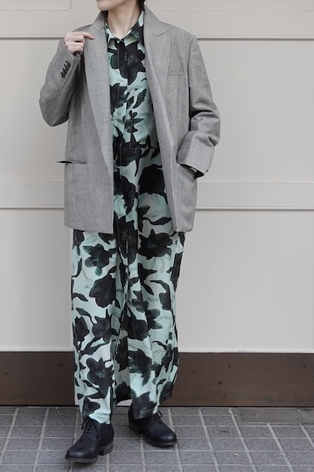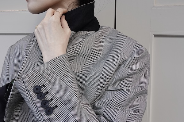 今季はメンズライクなボックスシルエットと太めの袖がポイントになったジャケット。少しゆったりめに着ていただくスタイルがおすすめ。