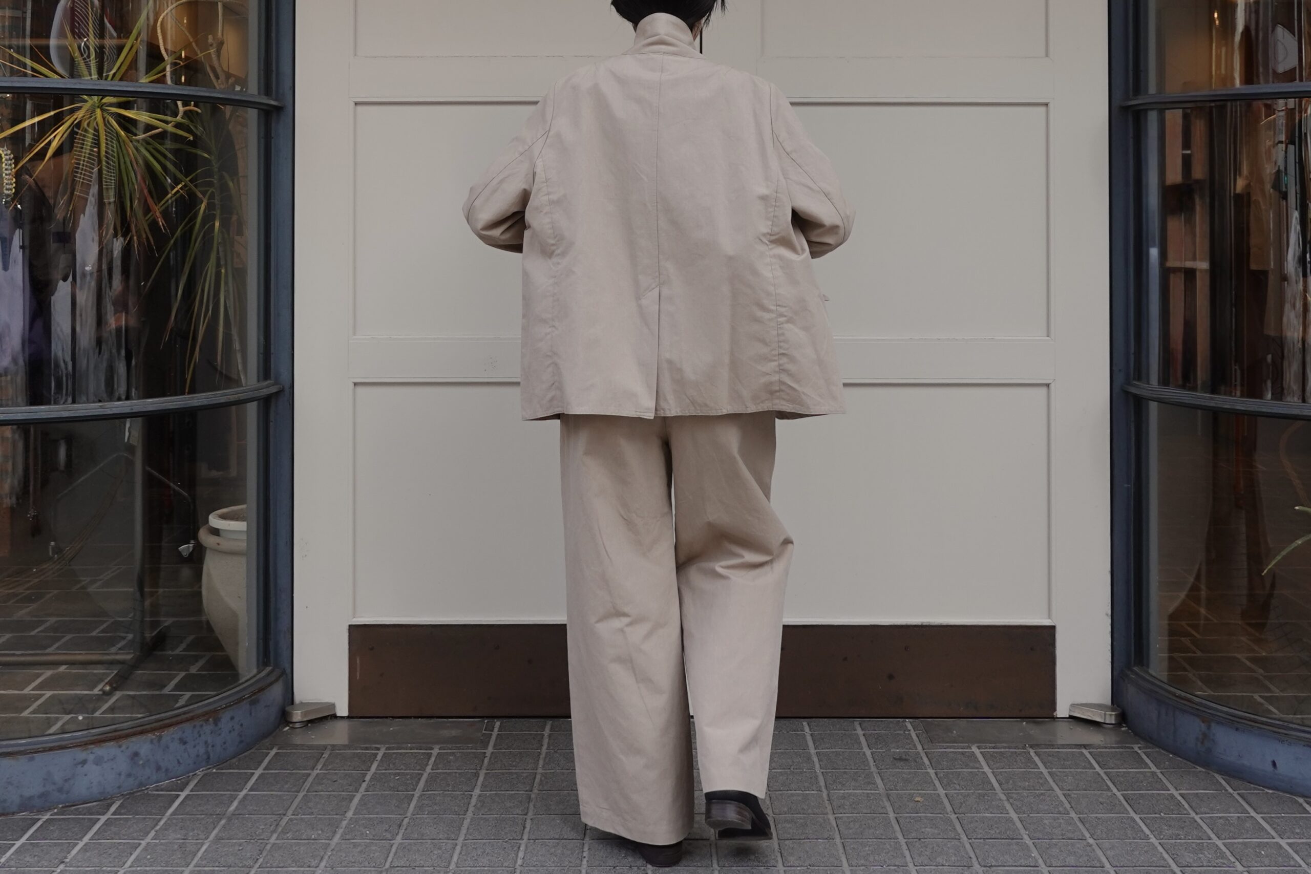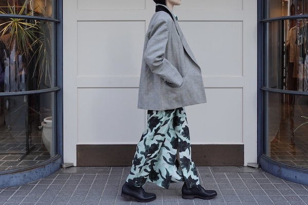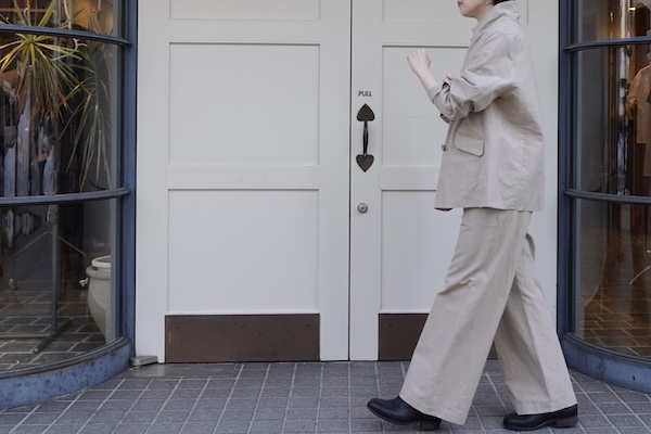 同素材のパンツもゆったりとしたシルエットで、ウエストにかけてのラインが美しく品がありながらもリラックス感のある穿き心地。