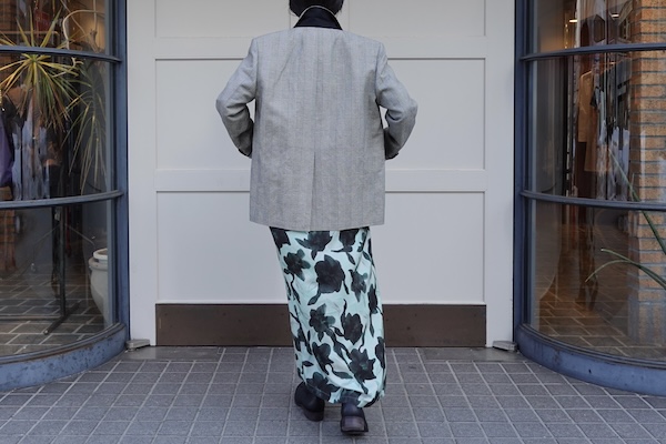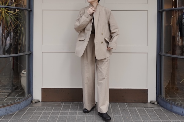 肩部分には薄いパッドが入っているので、立体的なシルエットを演出し全体をすっきりと上品な印象にまとめてくれます。パンツスタイルはもちろん、今回のスタイリングで合わせたワンピースのように柔らかな色合いと動きのあるラインで程よい抜け感をプラスしても素敵です。