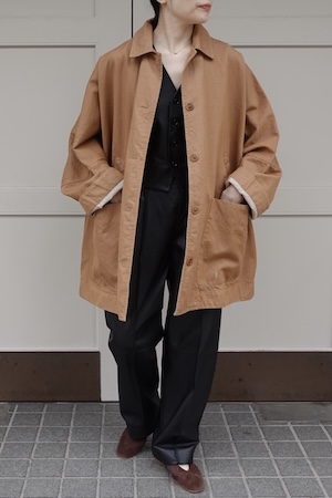 オーバーサイズでも着た時にしっとり落ちる生地が動くたびにシルエットを美しく見せてくれる。雰囲気のあるアウターをお探しの方はぜひ。