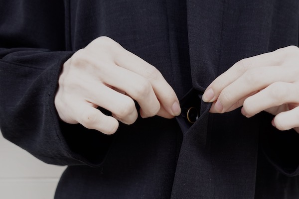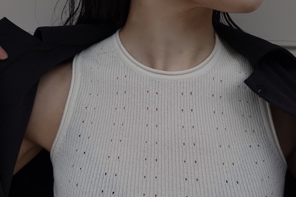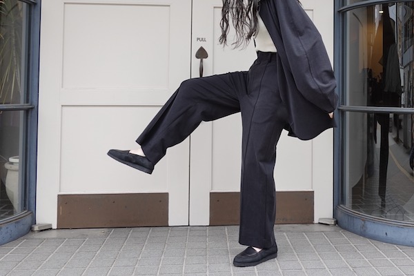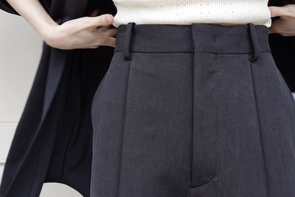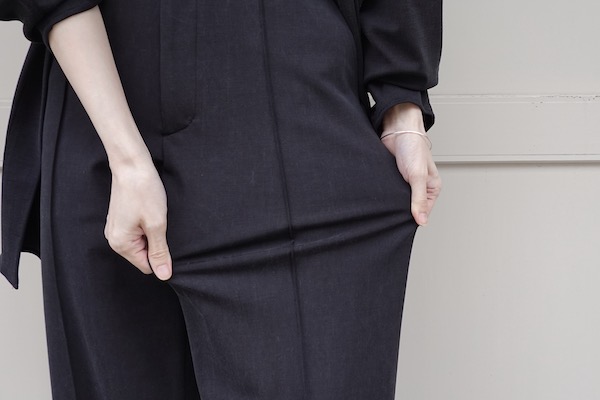 フロントにはピンタックが施されていて、シルエットも崩れず上品な佇まいです。言葉で伝えている以上に伸縮性があるのですが、見た目にはそれを感じさせない美しさ。