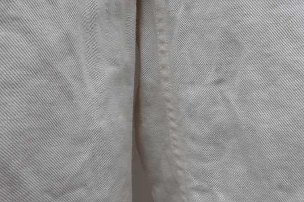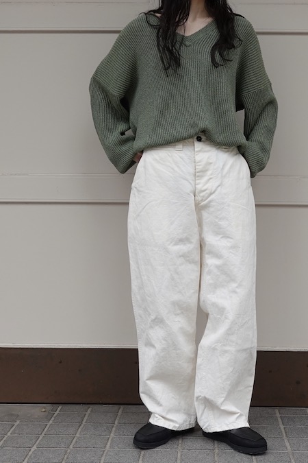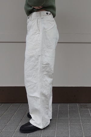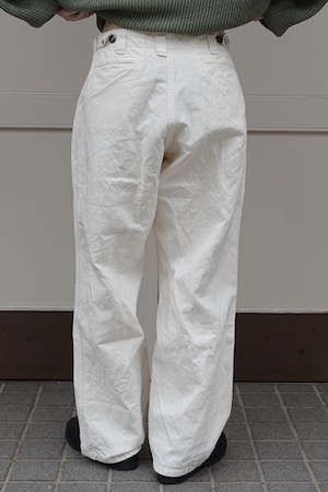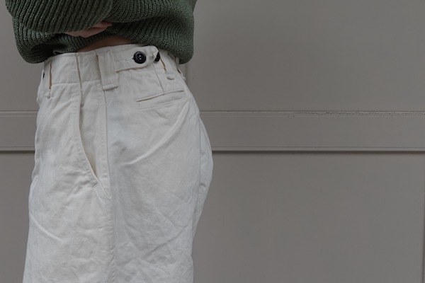 ゆったりとしたローライズのトラウザーズ。TUKIらしい手応えのある素材感はコットン×ヘンプドリル。ドライな質感とガーメントダイの生地の風合いが格好良いwhiteです。暖かくなると明るいパンツ履きたくなりますよね。ウエストはボタンで調節可能。