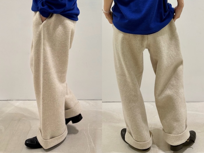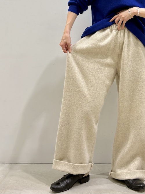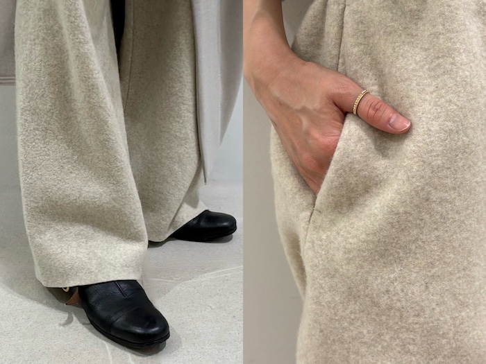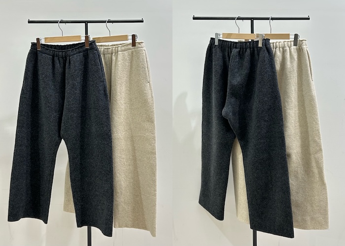 ドローコード仕様のイージーパンツは、伸縮性のある縮絨ウール生地で冬の季節に嬉しい一枚。