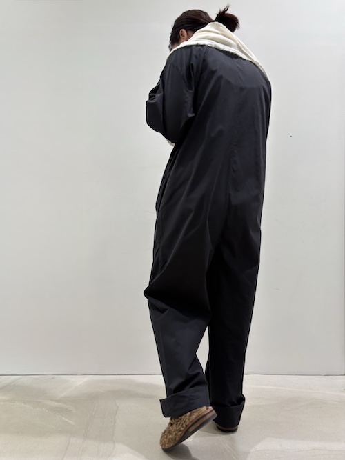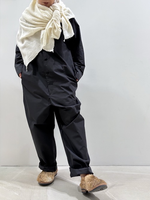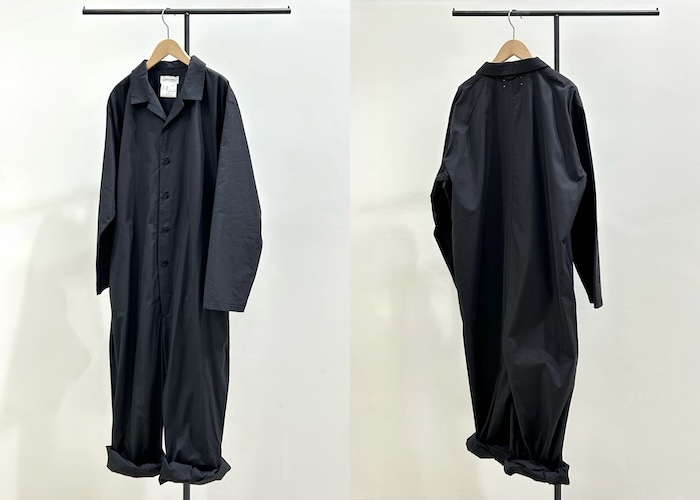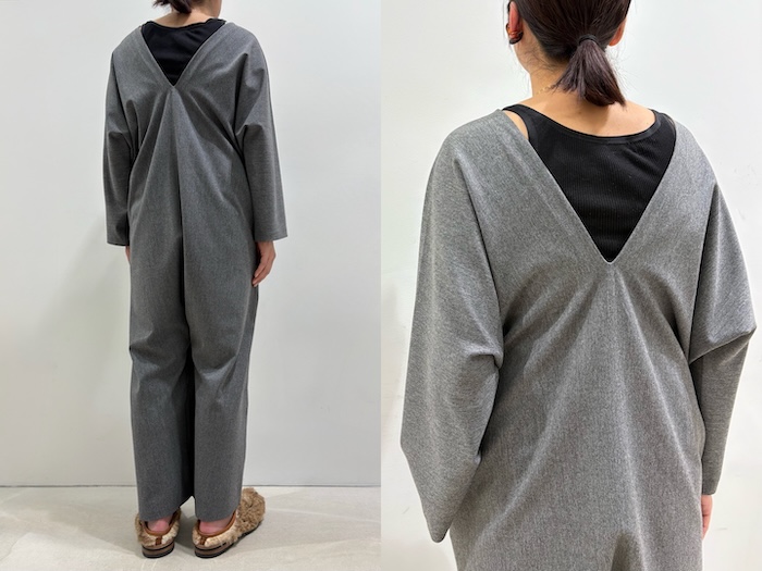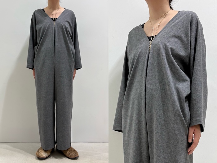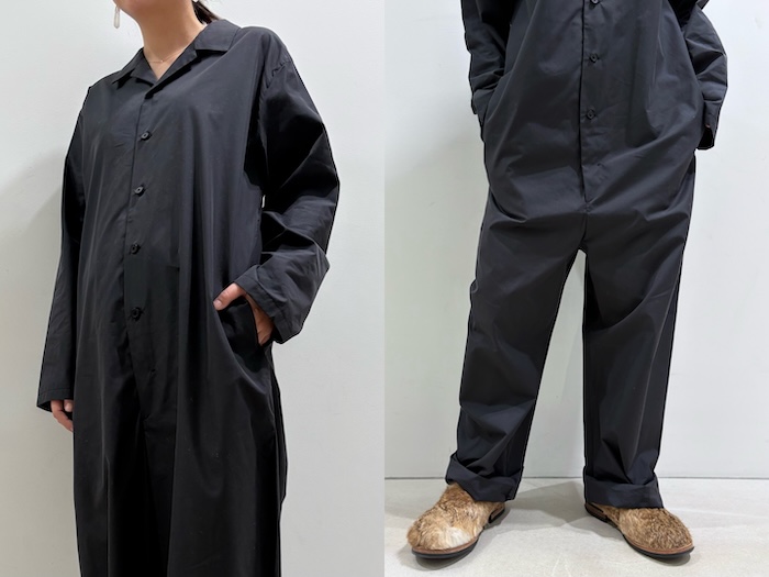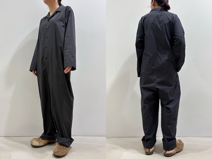 度々同ブランドで登場するオールインワンですが、今回登場したコットンシルクの高密度の平織生地は、着用した際のドレープが美しい。