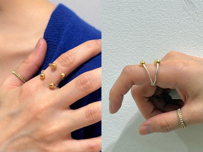 指を後ろから覆うようなかたちが新鮮で、フロントから見える4つのボールモチーフが光の粒のように煌めきます。